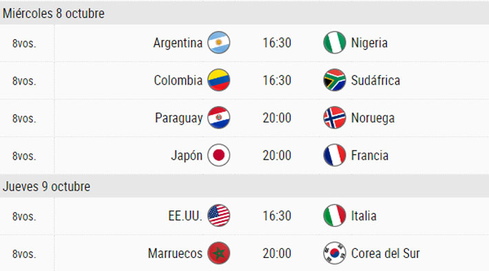 En tanto, España es el otro clasificado a los cuartos de final. Eliminó a Ucrania y enfrentará al vencedor de la llave entre Colombia y Sudáfrica, que también chocan a las 16:30 horas.