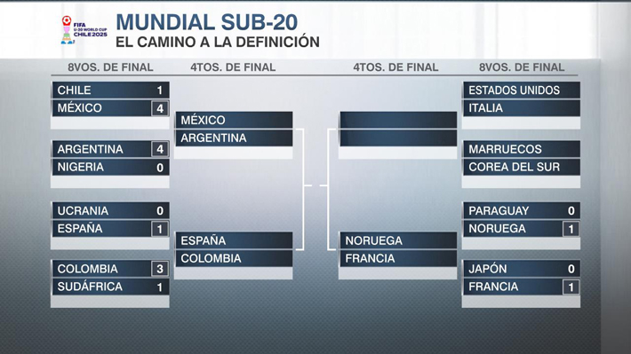 Argentina, que en esta jornada goleó a Nigeria, se medirá con México, el verdugo de Chile. Colombia, tras vencer hoy a Sudáfrica, desafiará a España.