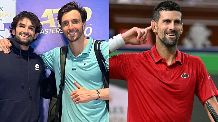 Los primos Valentin Vacherot y Arthur Rinderknech, y Novak Djokovic.