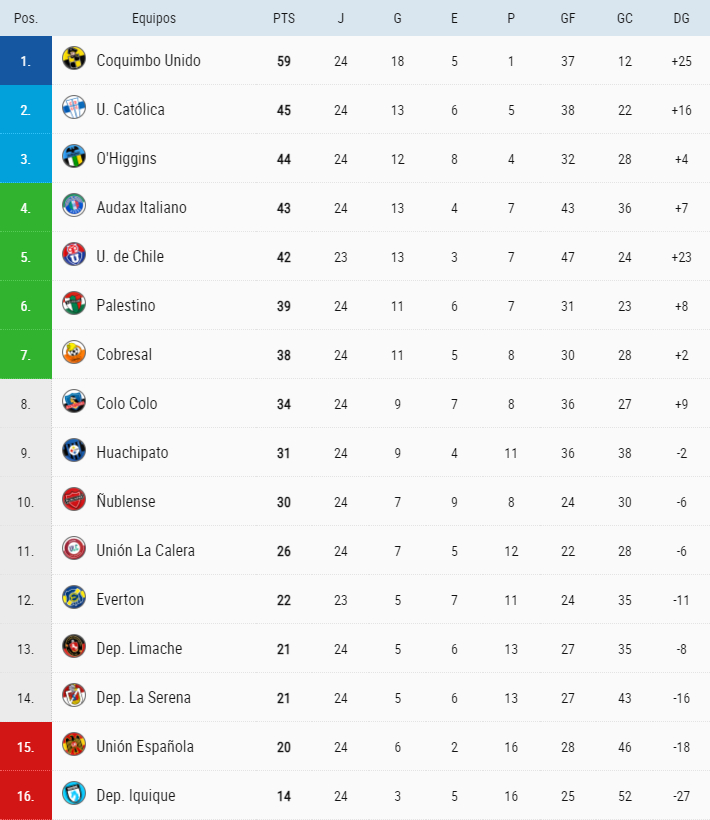 Por la fecha 25, Coquimbo visitará a O'Higgins, que está tercero con 44 positivos. El encuentro aparece programado para el 25 de octubre a las 20:00.