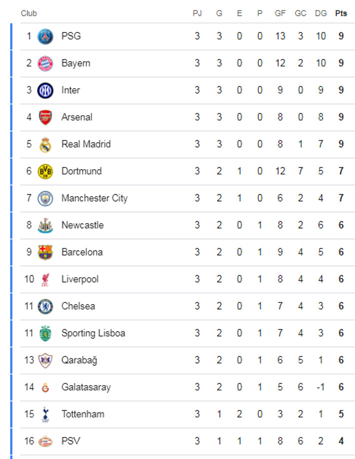 Luego de tres fechas, hay cinco clubes con campaña perfecta y liderando con 9 unidades. PSG, Inter de Milán, Arsenal y Real Madrid están en la cima.