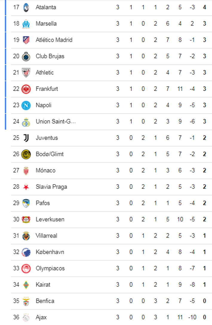 Un grande que se está quedando fuera hoy de la próxima ronda sería la Juventus. Otros importantes equipos que se ubican fuera de zona de clasificación son el Bayer Leverkusen, Benfica y Ajax.