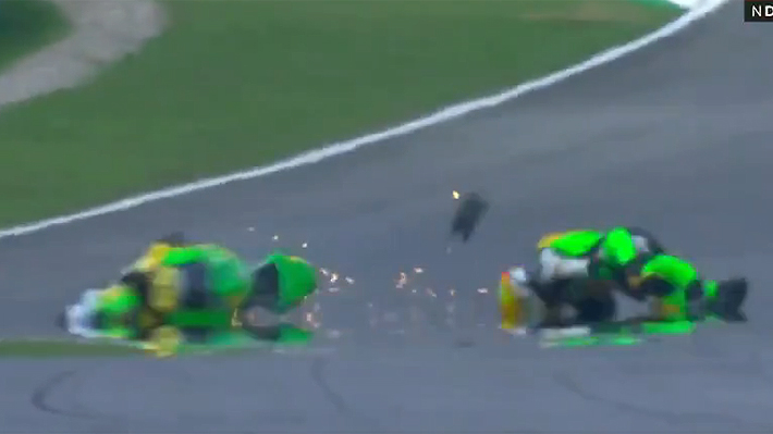 El impacto involucró a dos jóvenes pilotos. La salida de la curva tres vio cómo el suizo Noah Dettwiler, integrante del CIP Green Power, fue alcanzado de lleno por el español José Antonio Rueda, representante del Red Bull KTM Ajo y vigente monarca de la carrera.