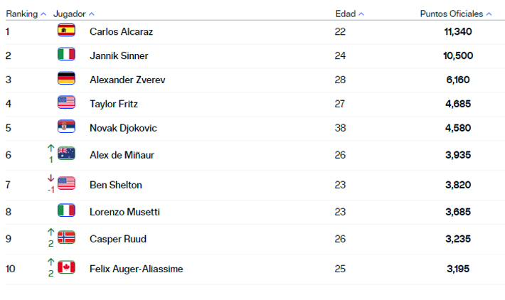 Álex de Miñaur subió del 7° al 6°, Ben Shelton bajó del 6° al 7°, Casper Ruud trepó del 11° al 9° y Félix Auger-Aliassime escaló del 12° al 10°.