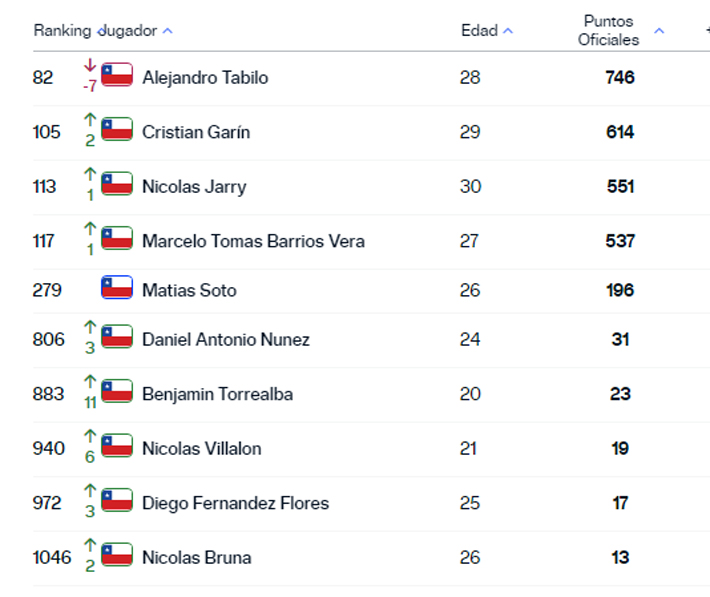 Le sigue Cristian Garin, que subió del 107° al 105°. Después viene Nicolás Jarry, que también trepó y ahora está 113°, aunque el "Nico" ya cerró el año.