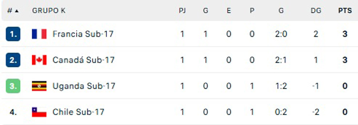 Chile quedó último del Grupo K con 0 puntos. Lideran los galos con 3 unidades, seguidos de Canadá que también tiene 3 y tercero Uganda con 0 pero mejor diferencia que los nacionales.