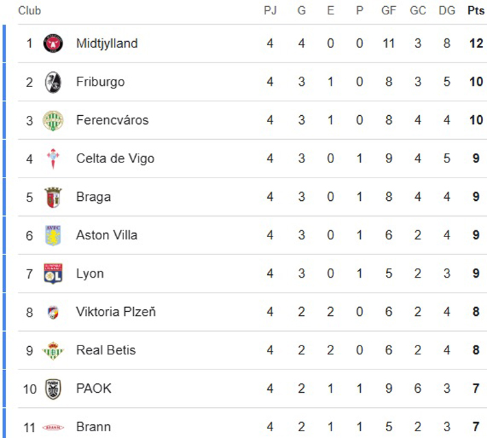 Con esta victoria, el equipo danés sigue con campaña perfecta en la Europa League. Ha ganado sus cuatro partidos y es el único líder de la fase de liga con 12 puntos.