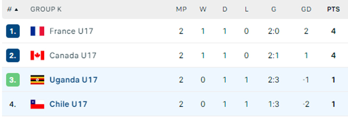 Francia es líder con 4, seguidos de Canadá que también tiene 4 pero con peor diferencia. Tercero es Uganda con 1 y cierra Chile con 1.