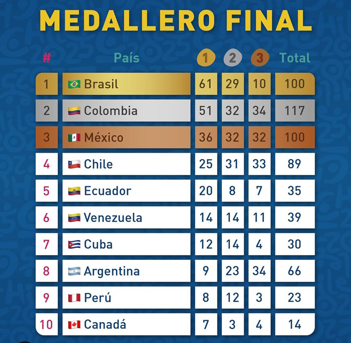 Chile finalizó en el cuarto puesto del medallero. Lo superaron Brasil con 100 preseas (61 de oro, 29 de plata y 10 de bronce), Colombia con 117 (51 de oro, 32 de plata y 34 de bronce) y México con 100 (36 de oro, 32 de plata y 32 de bronce).