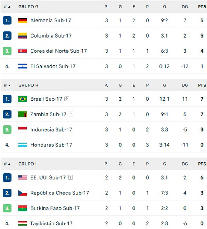 Por el Grupo G, Alemania aplastó 7-0 a El Salvador y terminó en la cima con cinco puntos. Colombia, que en la fecha final se impuso dos a cero ante Corea del Norte, también hizo cinco unidades y sigue en el torneo. El conjunto asiático, al igual que Egipto, aseguró ser uno de los mejores terceros.