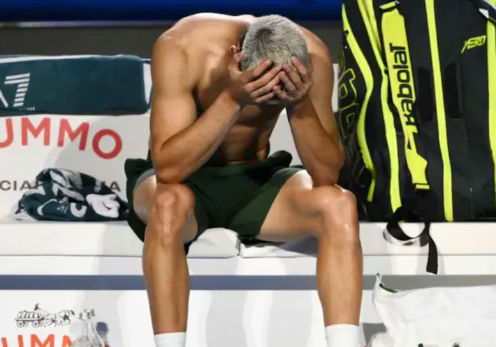 se viralizó en redes sociales. En la imagen se ve a Alcaraz sin polera, pensativo y mirando el suelo. Así estuvo por varios minutos.