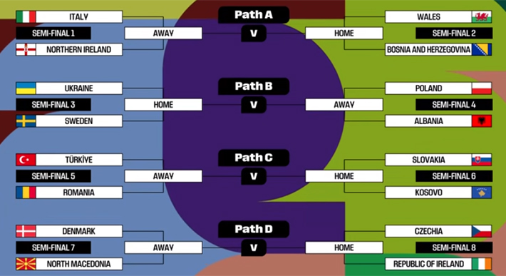 Las 16 selecciones de la repesca fueron divididas en cuatro zonas de cuatro equipos cada una y la ganadora de cada llave obtendrá un boleto directo al Mundial de 2026.