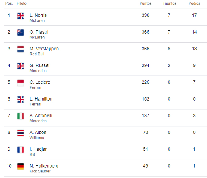 Hoy Norris sigue líder con 390 puntos, pero les sigue Piastri y el mismo Verstappen, ambos con 366 unidades.