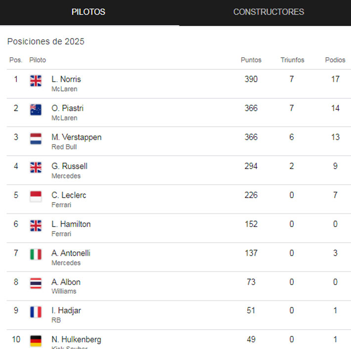 Antes de la carrera en Las Vegas, el dominio de Norris era claro: Tenía 390 puntos. Le seguía Piastri con 366 y luego venía Verstappen con 341. El liderato de McLaren era indiscutido.