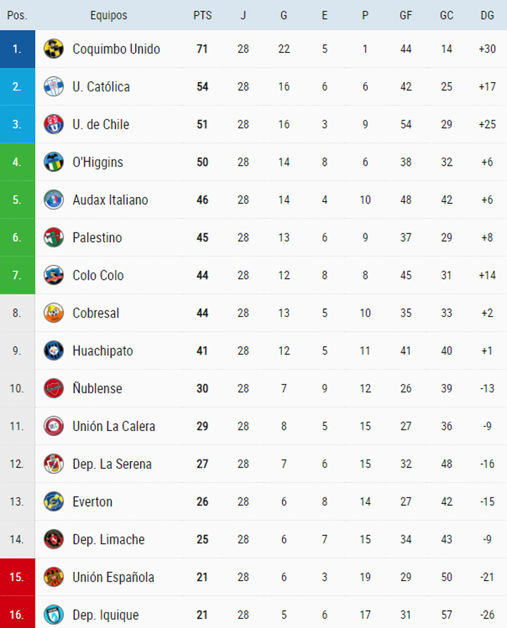 Hoy la UC es el Chile 2, la U el Chile 3 y desde el cuarto al séptimo van a la Sudamericana (en orden O'Higgins, Audax, Palestino y Colo Colo). Según los resultados del fin de semana, el orden puede cambiar.