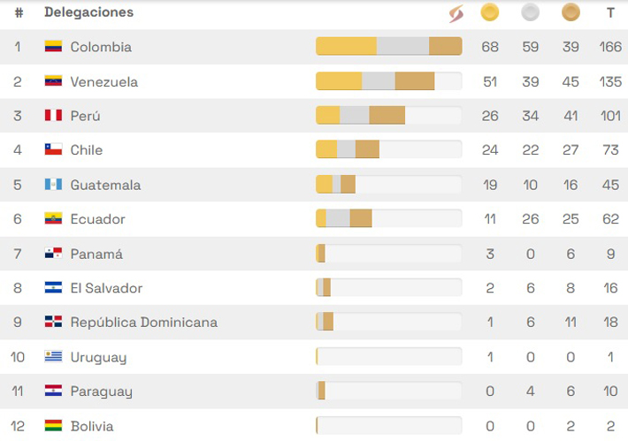 La delegación nacional suma 24 metales de oro, 22 de plata y 27 de bronce. Está en el cuarto lugar del medallero. El podio lo conforman Colombia, Venezuela y Perú.