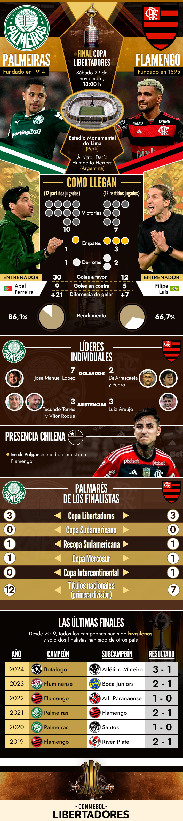 Dos multicampeones frente a frente: Los números de Palmeiras y Flamengo previo a la final de la Copa Libertadores