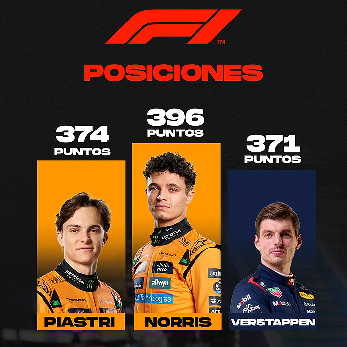 Tras este resultado, Norris sigue siendo el líder del campeonato de pilotos, con 22 puntos de ventaja sobre su compañero en McLaren y 25 sobre el neerlandés de Red Bull, cuando quedan dos carreras y 50 puntos por repartir en lo que queda de campeonato.