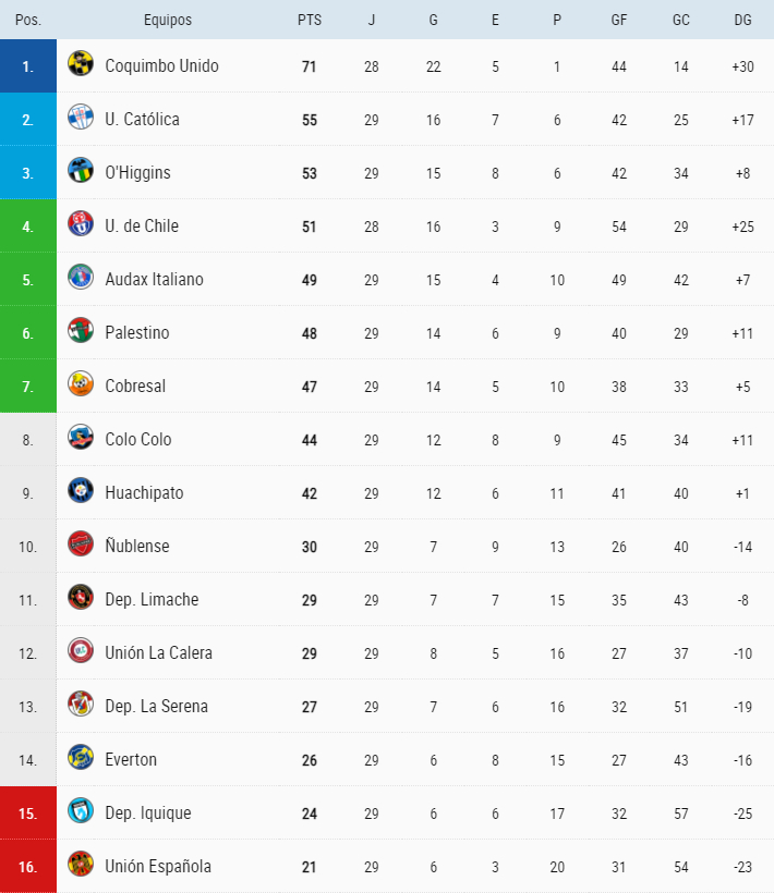 Este lunes el panorama se complicó aún más para el Cacique. Audax Italiano venció a Ñublense, aseguró Sudamericana y llegó a 49 unidades. Para Colo ya es inalcanzable, al igual que Palestino, que el sábado derrotó a La Serena y registra 48 positivos.