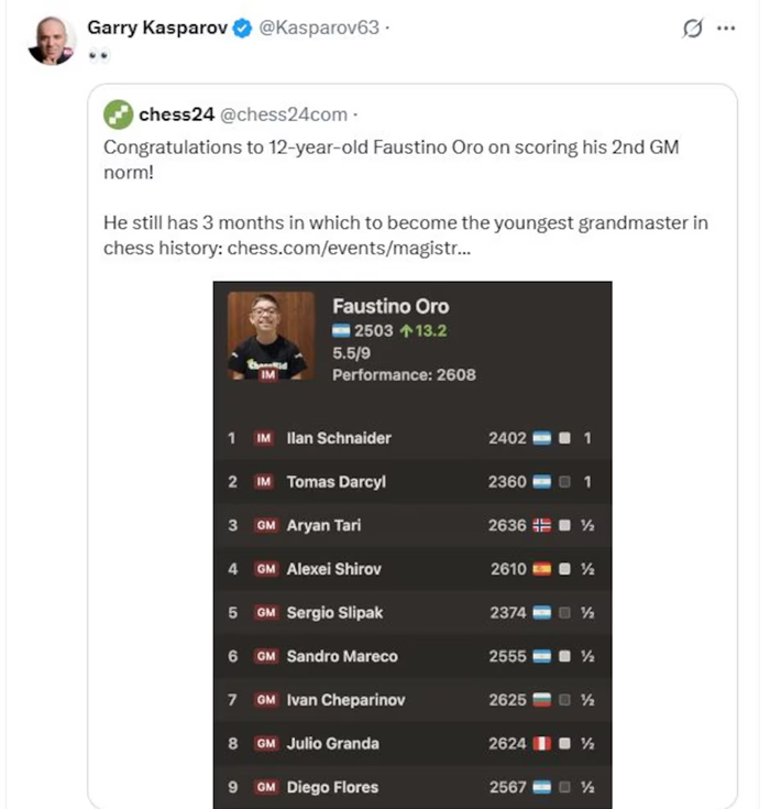 Incluso Kasparov, campeón de mundo entre 1985 y 2000 y uno de los mejores de la historia, reaccionó a lo logrado por Oro. El ruso en redes sociales reaccionó con un emoji de ojos atentos a la noticia de la segunda norma del trasandino, en lo que fue interpretado como um signo de expectativa por lo que pueda hacer el sudamericano en su incipiente carrera.