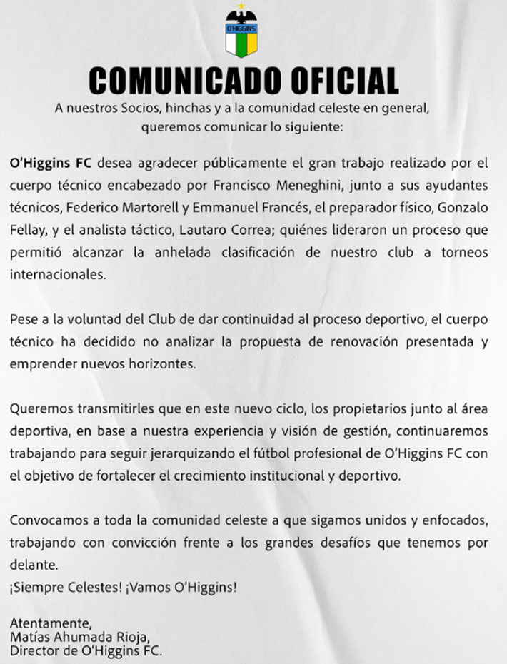 Desde la dirigencia de O'Higgins habían revelado que las conversaciones iban por buen camino y que todo apuntaba a que finalmente renovaría para dirigir al equipo en la Libertadores 2026. Pero no será así.