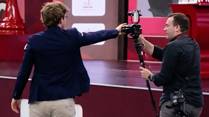 Luego de eso vino la explosión de Carlsen. Abandonó la sala visiblemente afectado por la derrota y con claros gestos de frustración. En su camino a la salida de la sala llegó a golpear a una cámara de televisión de un medio de la organización, que seguía sus pasos.