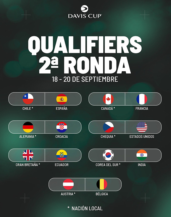 De esta forma, junto a chilenos, ecuatorianos y surcoreanos, también clasificaron Alemania, Croacia, Gran Bretaña, Bélgica, Austria, Estados Unidos, Chequia, Francia y Canadá, que se sumaron a España que ya esperaba rival. Estas llaves se jugarán entre el 18 y 20 de septiembre.