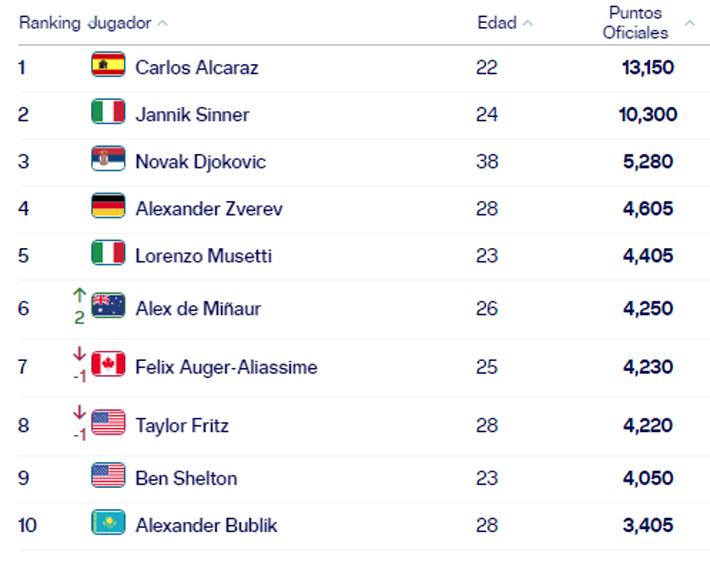En tano, en el top 10 hubo tres cambios. Carlos Alcaraz continúa en la cima, seguido por Jannik Sinner y Novak Djokovic completando el podio.