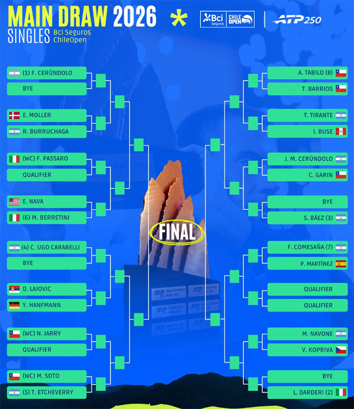 Matías Soto (317°), quien se dio la noticia de su invitación en la jordana de este viernes, jugará su primer cuadro principal a nivel ATP. Tendrá un duro rival como Tomás Etcheverry (51°), uno de los semifinalistas del ATP de Río de Janeiro.
