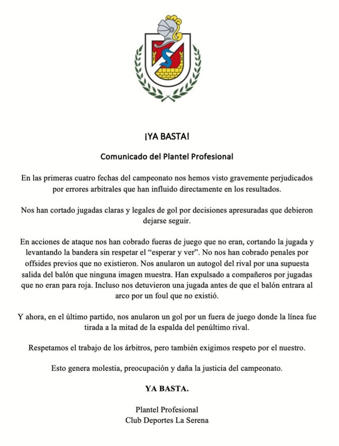 Cansados de la situación, el plantel profesional de Deportes La Serena emitió un comunicado criticando incluso situaciones de partidos pasados.