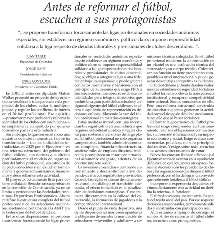 Días antes, incluso, Juan Tagle, Jorge Uauy y Jorge Contador, presidentes de la UC, Palestino y Coquimbo respectivamente, ya habían enviado una misiva al mismo medio explicando sus reparos con el proyecto. "Antes de reformar el fútbol, escuchen a sus protagonistas", titularon los dirigentes.