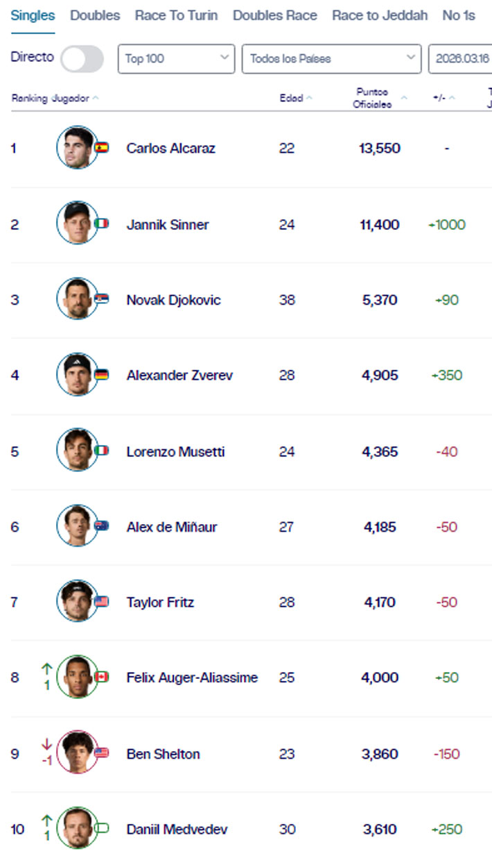 Carlos Alcaraz se mantiene al tope del ranking de la ATP, sin embargo, el triunfo de Jannik Sinner en el Masters 1000 de Indian Wells enciende la lucha por el sitial de privilegio.