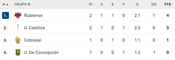 Con este resultado, los chillanejos quedan punteros con cuatro puntos y la UC segunda con tres unidades en el grupo B. Ambos deben esperar lo que pase en el duelo entre Universidad de Concepción y Cobresal que se juega este jueves.