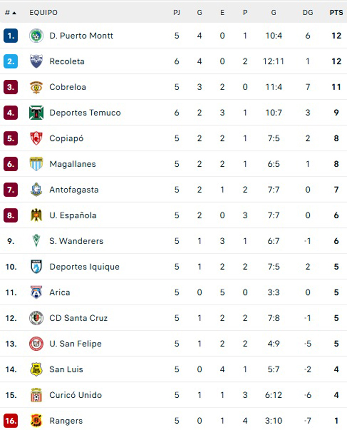 Con la derrota, el conjunto recoletano sigue en la cima con 12 puntos, pero Puerto Montt, que tiene el mismo puntaje, lo podría superar.