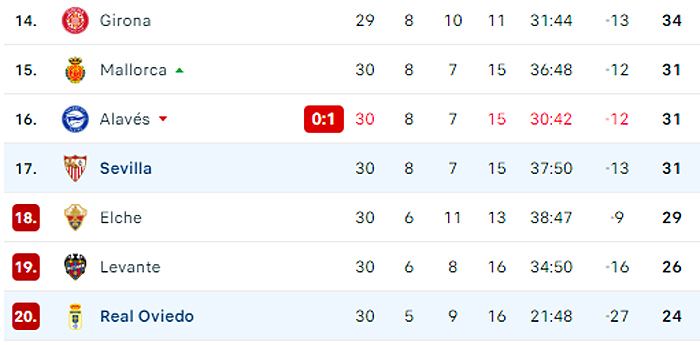 Estos tres puntos permiten al equipo azulón, dirigido por el DT uruguayo Guillermo Almada, mantener un fino hilo de esperanza de salvación: a falta de ocho partidos ven el objetivo, que marca el Sevilla (17º), con 31 puntos.