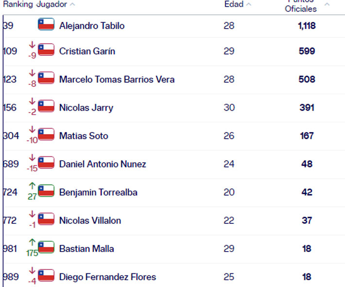 Alejandro Tabilo es el único que "zafa" esta semana. No tuvo variaciones y se mantuvo en el puesto 38° de la clasificación mundial.