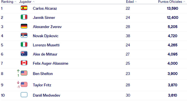 El top ten apenas sufrió cambios. Carlos Alcaraz sigue como número uno con 13.590 puntos. Le sigue Jannik Sinner con 12.400. El podio lo cierra Alexander Zverev con 5.205.