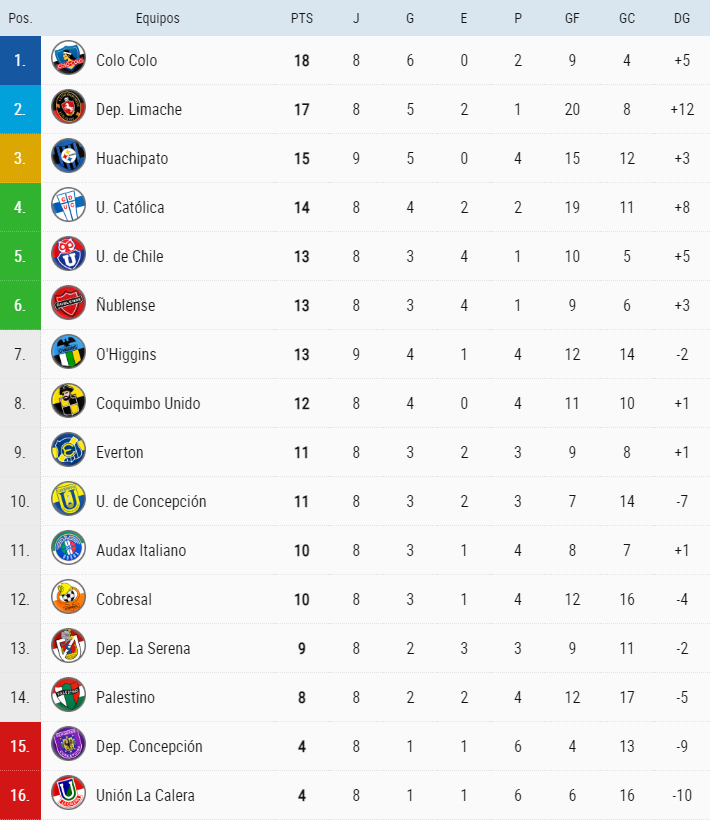 El líder de la Liga de Primera es Colo Colo con 18 puntos. Le sigue Limache con 17 y ahora aparece Huachipato con 15.