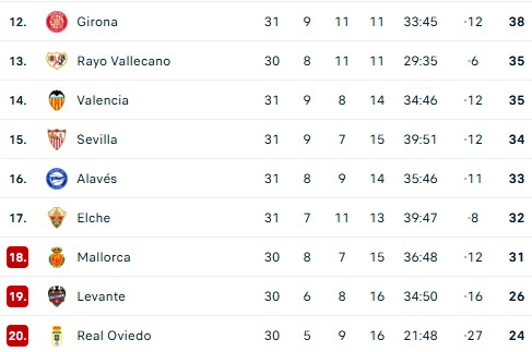 Para el Sevilla era muy importante ganar, ya que hoy, más temprano, el Elche derrotó al Valencia con gol de Lucas Cepeda y dejó a los nervionenses momentáneamente en puestos de descenso. Con la victoria, la escuadra de Luis García Plaza quedó en el decimoquinto puesto de la clasificación 35 puntos, tres por sobre la zona roja.