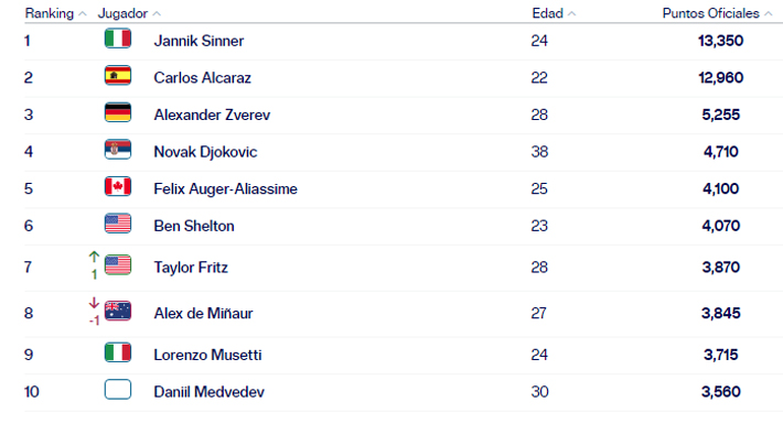 El 1° sigue siendo Jannik Sinner, seguido de Carlos Alcaraz y Alexander Zverev.