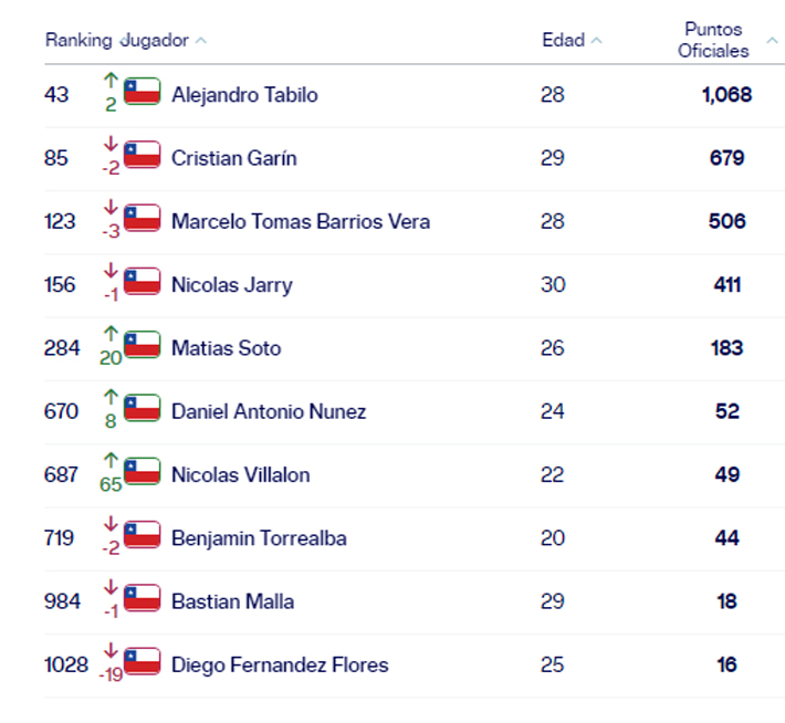 Tomás Barrios cayó del 120° al 123° y Nicolás Jarry del 155° al 156°.