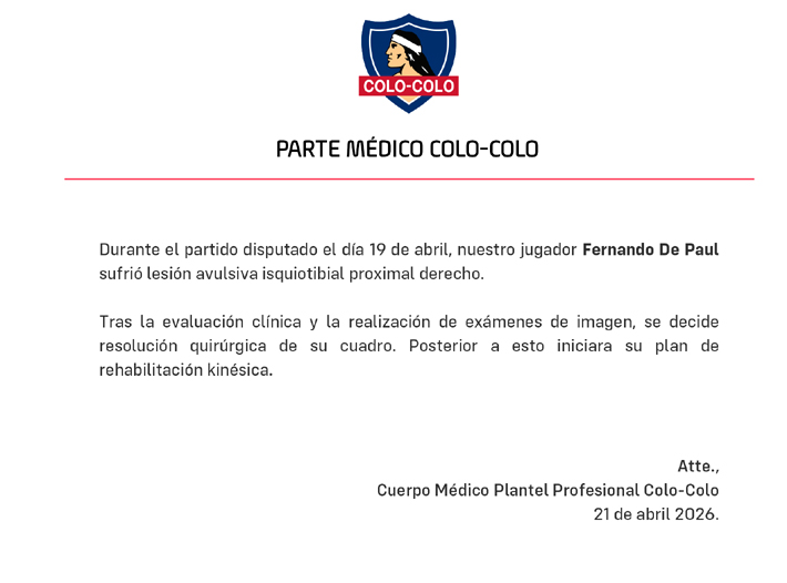 uestro jugador sufrió lesión avulsiva isquiotibial proximal derecho. Tras la evaluación clínica y la realización de exámenes de imagen, se decide resolución quirúrgica de su cuadro. Posterior a eso iniciará su plan de rehabilitación kinésica", dice.