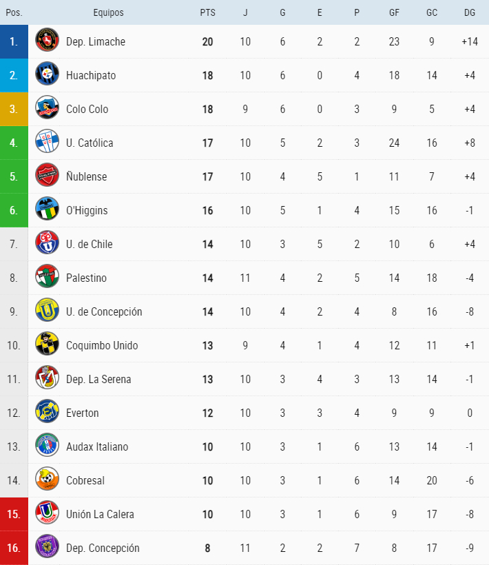 El líder es Limache con 20 unidades. Le siguen Huachipato y Colo Colo con 18.