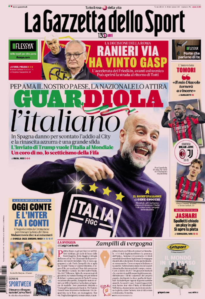 "Guardiola, el italiano". Así lleva su portada el diario más prestigioso de ese país, La Gazzetta dello Sport. Y es que el fútbol italiano sueña con la incorporación del español Pep Guardiola, entrenador del Manchester City, como DT de la "Azzurra", después de que el 'calcio' siempre haya estado en la mente del técnico y de que nunca haya descartado asumir un eventual cargo al frente de la selección transalpina.