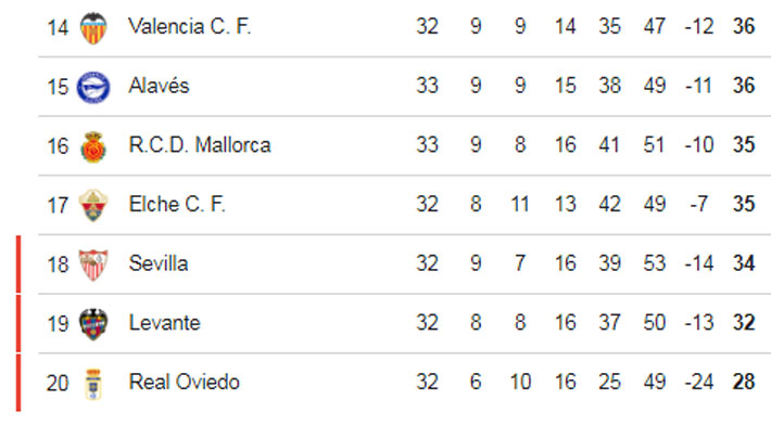 El Sevilla está 18° con 34 puntos. Arriba aparecen el Elche y el Mallorca con 35 y el Alavés y el Valencia con 36. Todo muy apretado.