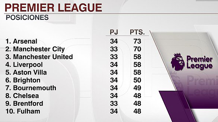 El triunfo devuelve al liderato al Arsenal, con 73 puntos y una diferencia de goles de +38, mientras que el City, que tiene un partido menos (ante Crystal Palace), es segundo con 70 unidades y +37.
