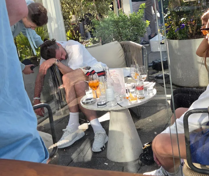 Según cuenta el The Sun, Grealish fue fotografiado la tarde del sábado en la azotea del bar Stories en Manchester, totalmente dormido y rodeado de copas y cócteles.