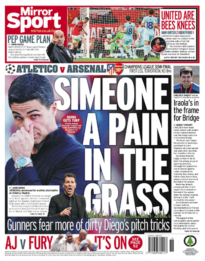 "Simeone un dolor por el césped", recoge la portada del diario deportivo, haciendo un juego de palabras con "ass" (culo) y "grass" (hierba), en el llegan a afirmar que el club del norte de Londres "teme más trucos sucios de Diego con el césped" que, según este medio, utilizó en las rondas previas ante el Tottenham Hotspur y Barcelona.