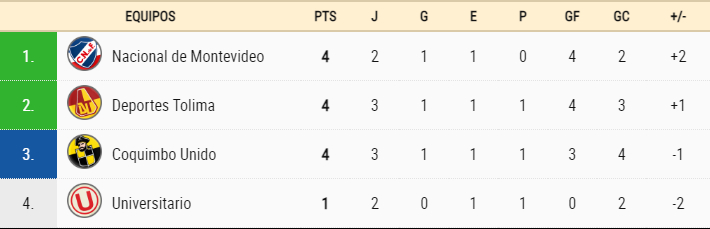 La derrota deja todo muy apretado en el Grupo B. Los tres primeros tienen 4 puntos: Nacional de Uruguay, Tolima y Coquimbo. Último está Universitario con 1 unidad.