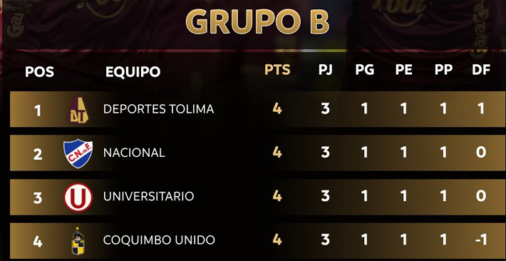 El Grupo B de Coquimbo es una verdadera locura. Los cuatro equipos tienen 4 puntos. Lidera Tolima, seguida de Nacional de Uruguay, Universitario y cierran los chilenos, últimos por diferencia de gol.